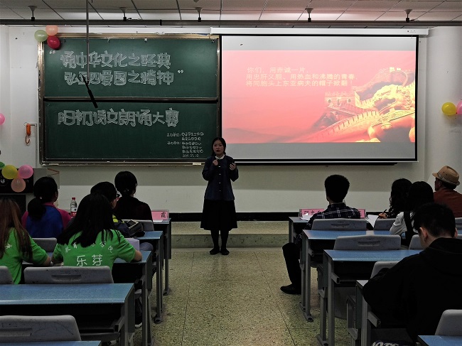 本网讯(文、图/罗祺平)为传承经典文化,弘扬五四精神,营造健康积极的文化氛围,5月14晚七点,由党委学生工作部、教科学院主办,教科党建中心、传媒中心和教科易班分站承办的"诵中华文化之经典,弘五四爱国之精神”主题"阳初"诗文朗诵比赛的决赛在行知楼314教室如期举行。全校十五学院的学生代表参与决赛,评委由关工委老教授敖良义、体育学院党总支书记钟英、学生处副处长丁敏娜、四川省普通话测试员翟雅媛以及学生处易班负责人强光平组成。教科学院党总支书记杨霞、副书记张波参加了朗诵会。