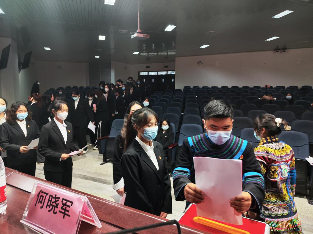 第二阶段,进行团学干部选举。大会审议通过了《乐山k8凯发第九届青年团员暨学生代表大会选举办法》,宣读了候选人名单并进行了第九届团学组织委员选举,现场分发选票,然后进行投票、计票,根据计票结果,选举出了杨婷婷为分团委书记,张滢滢、李茂月、邓鹏为分团委副书记,青艺培、黎杰等人为主要团学干部。