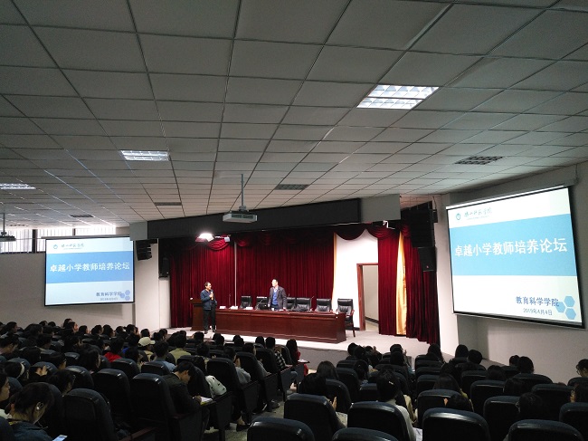 本网讯(文、图/刘可欣)教育科学学院于4月4日16:30分在特教大楼A栋学术报告厅开展了“卓越小学教师培养论坛”专题讲座。本次讲座由全国中小学“万人名师”、我校优秀校友程远友主讲。讲座由教科学院吴永胜博士主持,2017、2018级小学教育专业学生聆听了此次讲座。