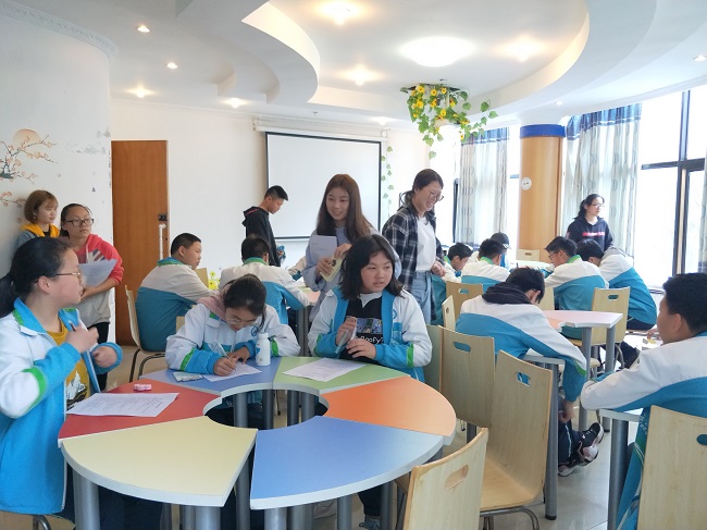 2019年4月8日上午,乐山k8凯发乐芽织心志愿者团队来到实验中学开展为期4天的见习活动。在老师的带领下志愿者们一起参观了实验中学未成年人心理成长指导中心、“心理宣泄室”等功能室。中午志愿者们和实验中学的心理健康教师干老师一起参加了心理委员会议,了解了实验中学日常的心理工作是如何开展的,并在会议上分发了宣传手册,向心理委员宣传本周即将开展的活动。