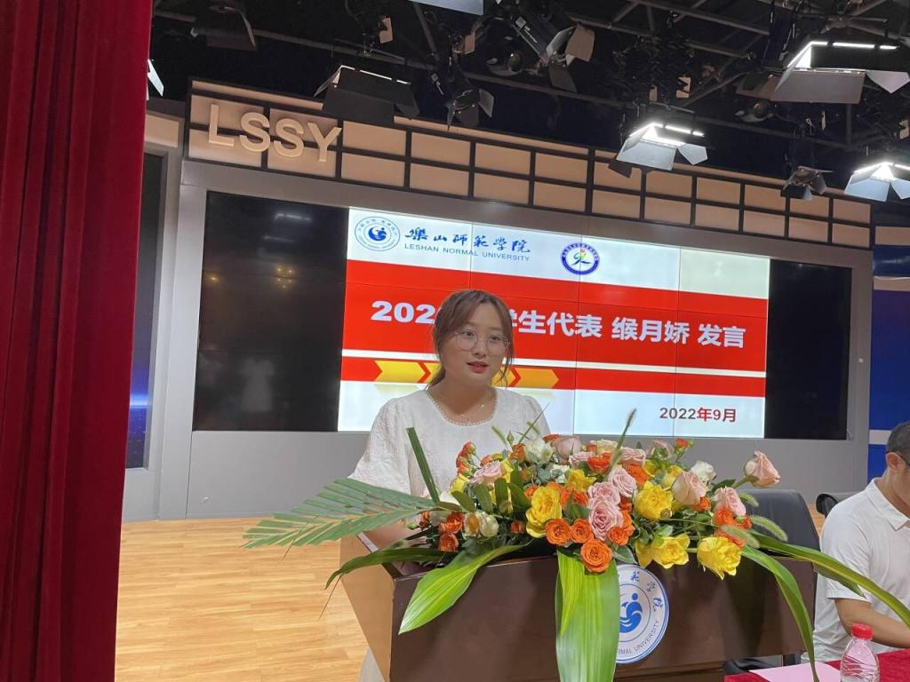 2022级心理学专业新生代表吴芯颖发言,畅谈对大学生活的向往,希望能在乐师追寻和实现自己的梦想。