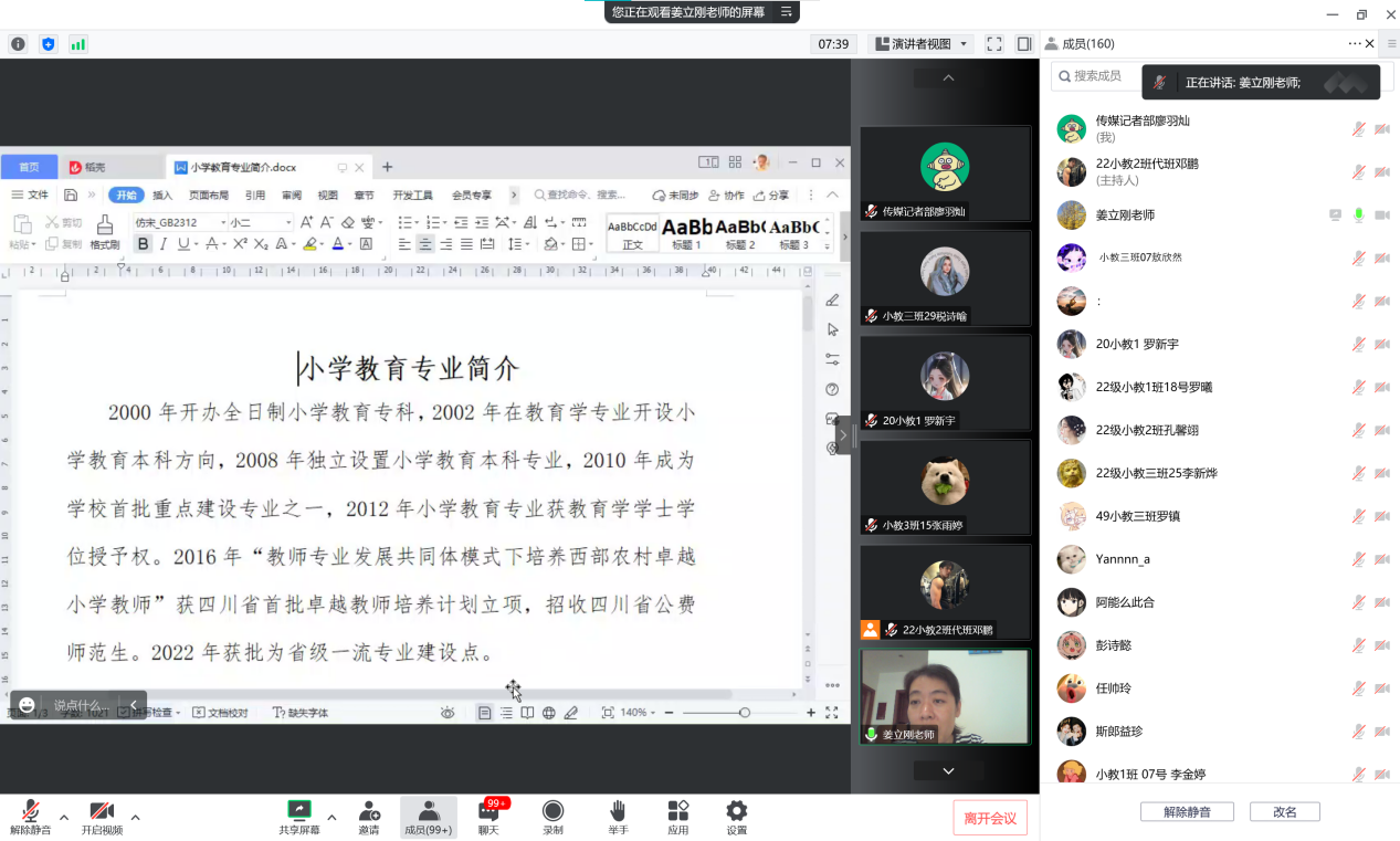 本网讯(文、图/廖羽灿)为了促使2022级教院学子明确学习方向,了解专业情况,系好大学生活的第一颗扣子,教育科学学院通过“云端”相聚的方式顺利开展了新生专业导论课。心理学专业王立新教授、小学教育专业姜立刚副教授、科学教育专业毛加宁教授亲自分别为这三个专业的同学们授课指导学习方向。
