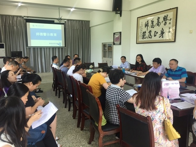 警示会上,杨霞首先通报了我校个别教师违反师德师风的行为和受到党纪处分的情况。并与大家重温了《乐山师范学院党风廉洁风险迹象精细化记分管理办法指导手册》和《乐山师范学院师德教育手册》。两个手册细化了乐山师范学院每个教师的行为规范,希望大家严格遵守。她强调我院历来注重加强师德师风建设,大家要以我校发生的个别现象作为警示,干部教师要汲取他人的教训,懂得自尊自爱自重,共同营造教书育人、风清气正的良好环境,用严明的纪律尺子管好自己,用良好的道德情操约束自己,不断增强遵纪守法、廉洁自律的自觉性,在工作和生活中倍加珍惜 “教师”的神圣称号,坚守好做人的底线,争做“传道、授业、解惑”的典范。