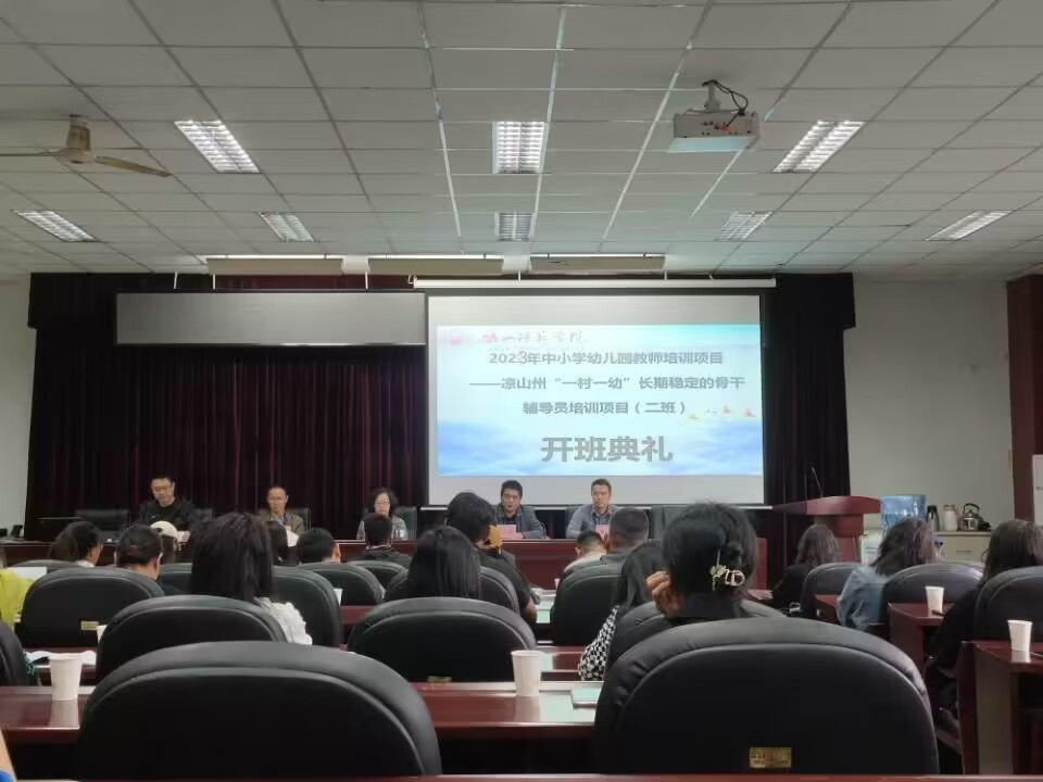 本网讯(文、廖天会/图、何琳琳)4月3日上午,由乐山k8凯发承办的四川省2023年中小学幼儿园教师培训市(州)实施项目——凉山州“一村一幼”长期稳定的骨干辅导员培训项目(2班)开班典礼在弘毅楼412教室顺利举行。乐山k8凯发院长、国培项目首席专家汪红烨、党委书记罗立顺、副院长徐世鼎、副院长唐前军、学前教育系主任余祥和来自凉山州的50名骨干辅导员参加了此次开班典礼,典礼由徐世鼎主持。