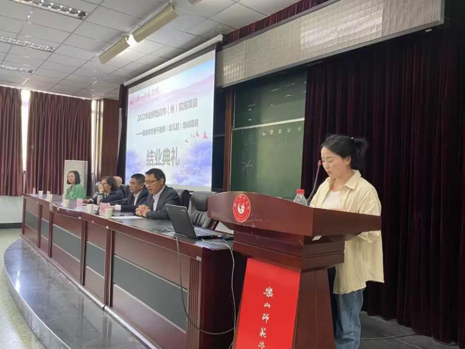 最后,优秀学院代表上台发言。来自乐山市井研县马踏镇中心幼儿园的文秋霞老师做了学员心得分享,她在发言中表示:通过十天的培训进一步更新了教育信息和理念,在接下来的工作中应认真反刍,融会贯通,把这些知识转化为教师成长和园所发展的助推剂;来自乐山市实验幼儿园高新区分园幼儿园的陈曦冉老师从学习党的二十大报告指引下乡镇幼儿园发展展望、游戏的方式调节情绪以及跟岗观摩学习三个方面阐述了培训收获,并表示将立足岗位职责,用专业知识来指导日常的教育教学工作;共安彝族乡林丰村幼儿园的阿余娘良表示在返岗后继续在工作中实践,将专家教授的先进理念和实践知识带到自己的工作幼儿园,让更多孩子受益。