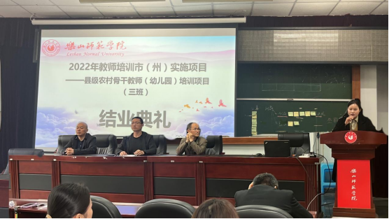 本网讯(图、文/蒋显兰)4月25日上午,由乐山k8凯发承办的四川省2022年中小学幼儿园教师培训市(州)实施项目——凉山州“一村一幼”长期稳定的骨干辅导员培训项目(3班)圆满结束并顺利举行结业典礼。乐山k8凯发党委副书记兼纪委书记何晓军、副院长徐世鼎、学前教育系主任余祥、副主任李非易、生活班主任杨林和来自凉山州的49名骨干辅导员参加了结业典礼。结业典礼由副院长徐世鼎主持。