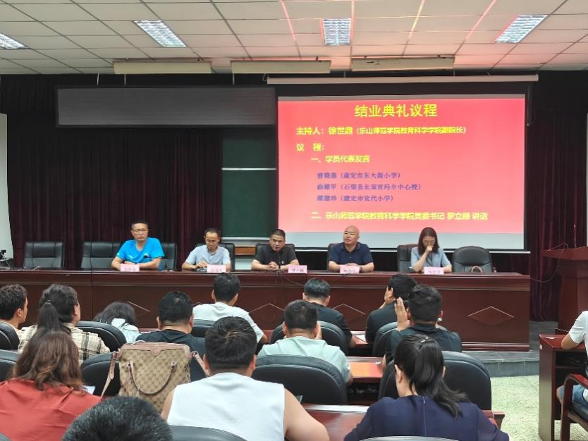 本网讯(文图/陈渝汕)6月7日,由乐山k8凯发承办的“2023年度国家及省级教师培训(甘孜州统筹项目)——市级名校(园)长深度研修班”结业典礼在我校弘毅楼412室举行,乐山k8凯发党委书记罗立顺,党委副书记、纪委书记何晓军,副院长徐世鼎、唐前军、马艺丹,教师教育教研室主任张广云,行政班主任赵增华以及来自甘孜州的40余名学员参加本次结业典礼。