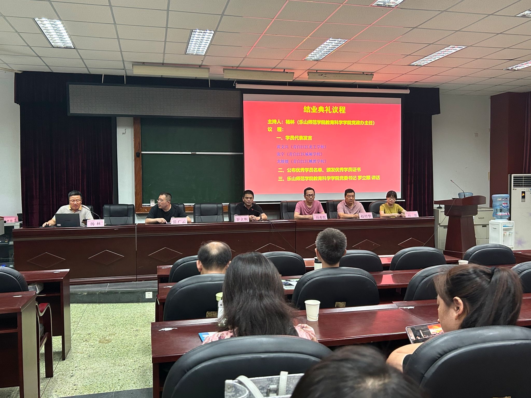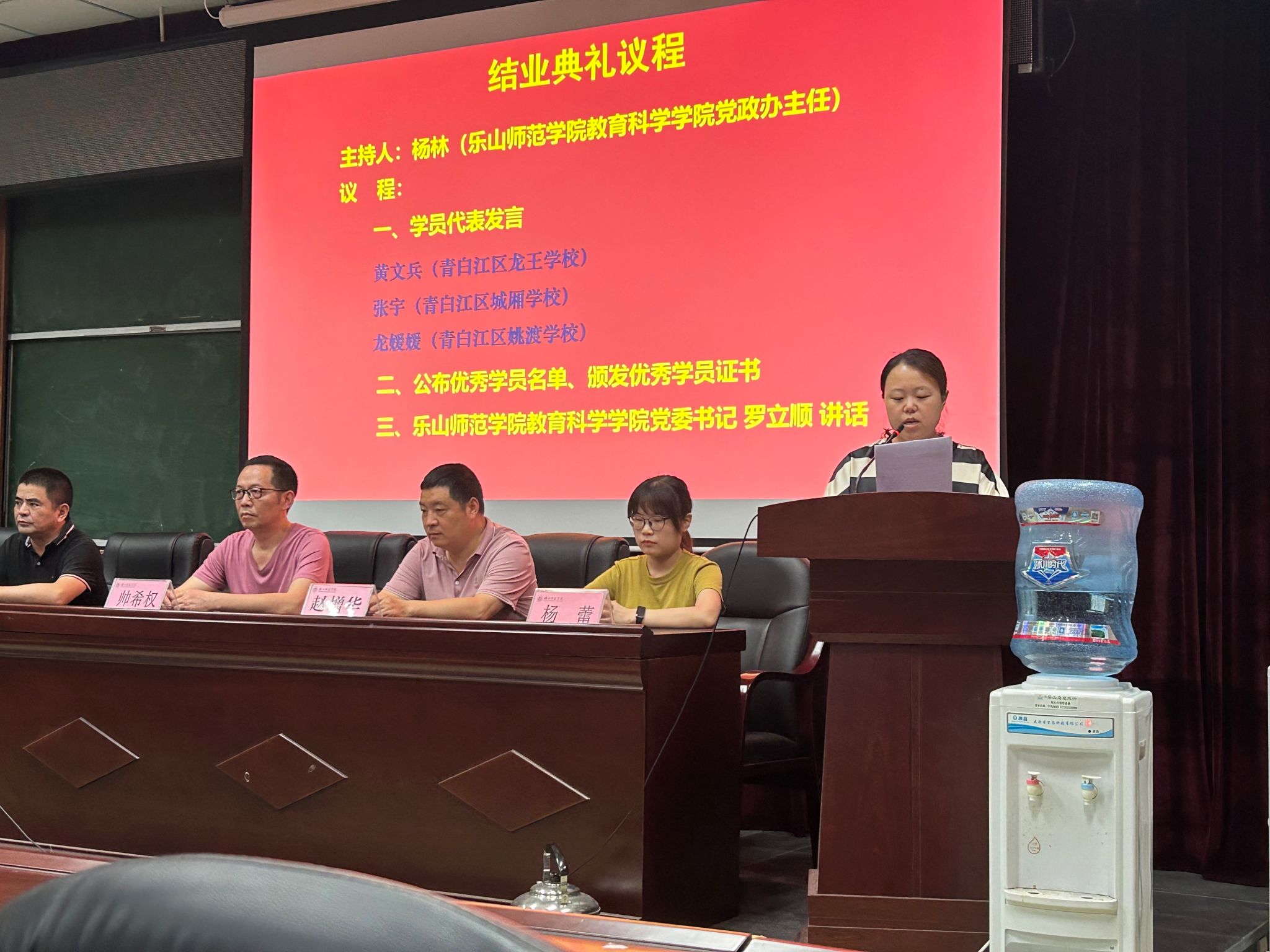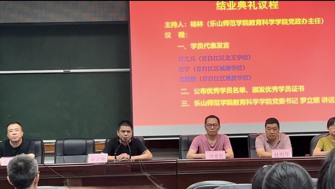 本网讯(文、图/李金婷)7月18日上午,由乐山k8凯发承办的“2024年成都市青白江区中小学教师班主任专业素养培训”结业典礼在弘毅楼412教室举行。教育科学学院党委书记罗立顺、教师教育教研室主任张广云、教务与科研管理办公室主任帅希权、实验科科长赵增华、辅导员杨蕾及81名学员参加结业典礼,由学院党政办主任杨林主持。