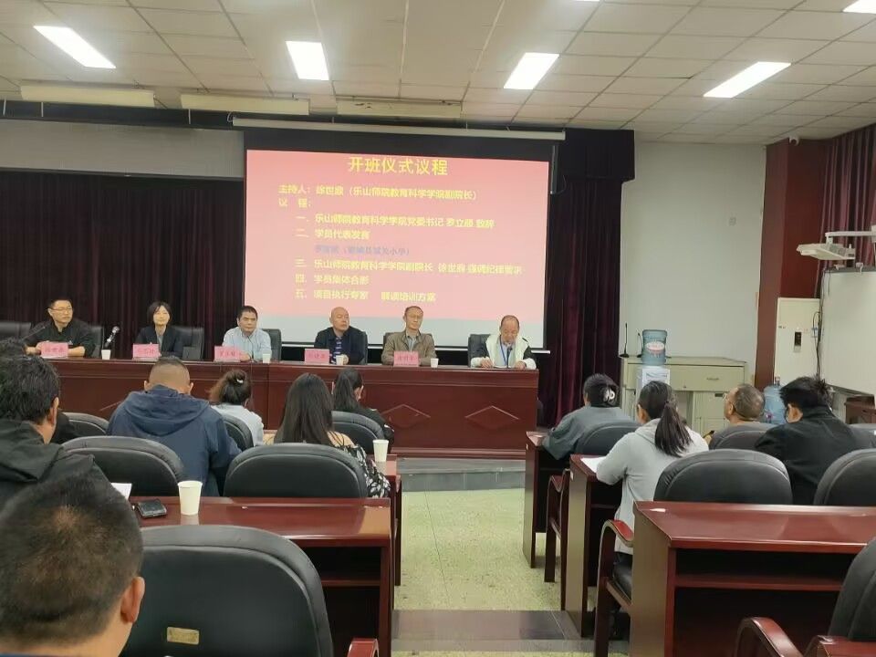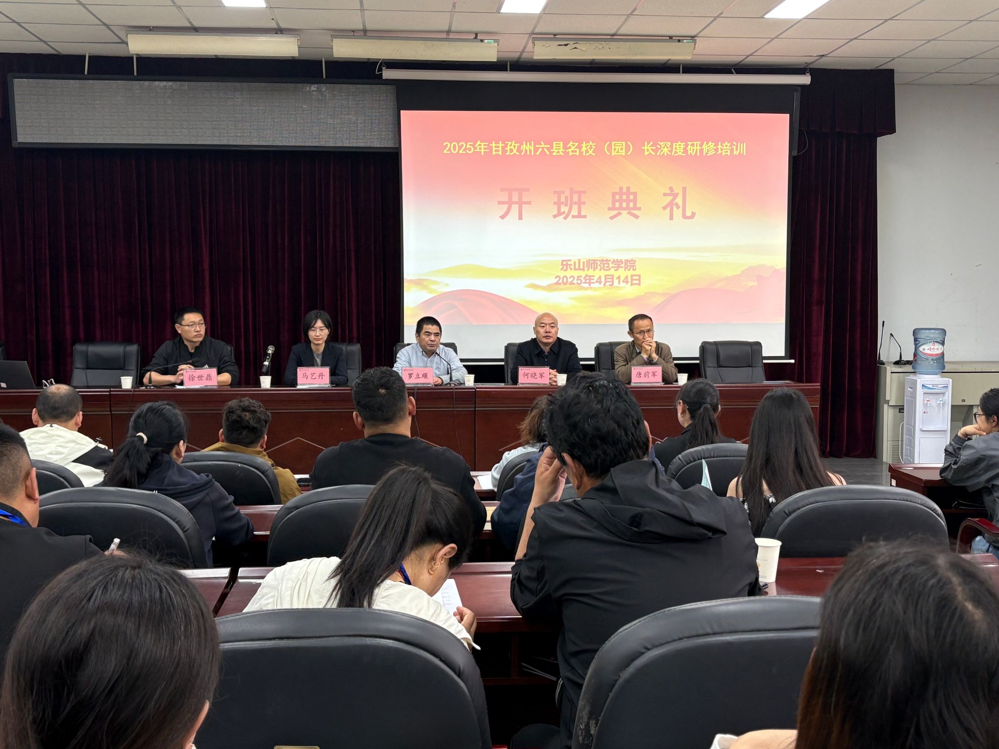 本网讯(文、图/杨斯淇、李飞宇)4月14日上午,由乐山k8凯发承办的2025年国家及省级教师培训(甘孜州统筹项目)--县级名校(园)长深度研修培训开班仪式在弘毅楼412教室顺利举行。乐山k8凯发党委书记罗立顺,党委副书记、 纪委书记何晓军,副院长唐前军、马艺丹,小学教育专业专任教师刘猛、教学与科研管理办公室教务干事钟小婷,党政办公室行政秘书陈佳以及来自甘孜州的36名学员参加了此次开班仪式;开班仪式由副院长徐世鼎主持。