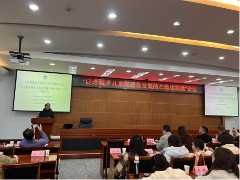 论坛开始,首先由乐山师范学院附属小学副校长刘建波作题为《乐师附小促进儿童高质量发展的在地化实践》的主旨报告,他立足于小学教育中的实际情况,以详实的数据与案例进行分析与阐述;然后乐山市市中区洙泗塘幼儿园党支部书记、园长方颖进行报告分享,题目为《幼儿园课程建设高质量发展:现状·归因·价值--基于对“游戏回顾中师幼对话研究”的前置思考》,对在学前儿童游戏环节中教师遇到的具体问题进行探讨和思考;接下来来自甘孜州丹巴县章谷镇水子片区寄宿制学校的郑明钢校长,生动形象地讲解了少数民族地区小学的特殊性与现实因素,以活动课程推动民族地区乡村儿童高质量发展的在地化实践;最后,乐山市市中区苏稽镇新桥幼儿园党支部副书记王瑶阐述了乡镇幼儿园的差异性,提出以乡土文化课程推动乡村幼儿园高质量发展的在地化实践。