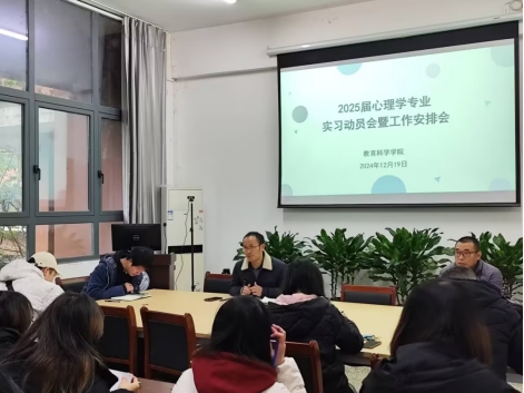 本网讯(文/陈小梅、图/陈小梅)为助力心理学专业学生平稳步入实习阶段,增强职业技能与专业素养,教育科学学院于12月19日上午10点10分,在学院会议室召开了2025届心理学专业实习动员会暨工作安排会。教育科学学院副院长唐前军教授、教务科长帅希权老师、教务秘书钟小婷老师、心理学专业负责人(本次实习带队教师)王立新教授、21级辅导员桂超老师及21级心理学专业全体同学参加此次会议,会议由桂超主持。