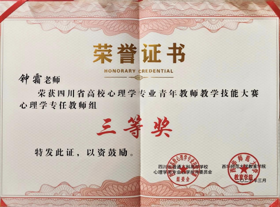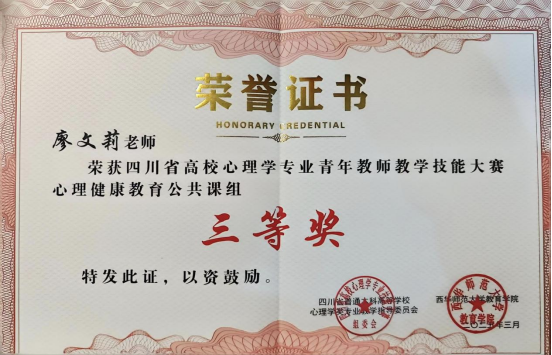 我院两名教师荣获第三届四川省高校心理学专业青年教师教学技能大赛三等奖