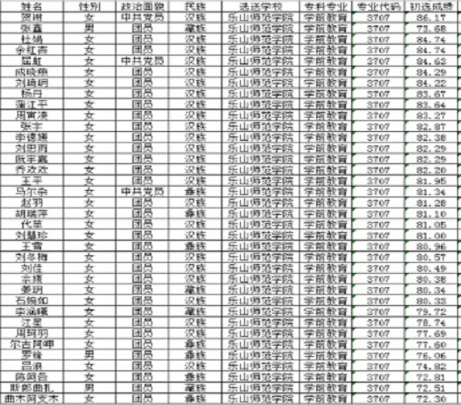 根据《乐山师范学院关于2019年选拔优秀专科毕业生进入本科阶段学习的通知》(乐师院教〔2019〕12号)文件要求,在前期组织宣传、报名的基础上,按照学院初试方案审查资格,报经学院党政联席会研究,拟向学校报送通过初试学生名单如下(详见附件:乐山师范学院2019年“专升本”学生初试汇总表(2019年4月15日)):