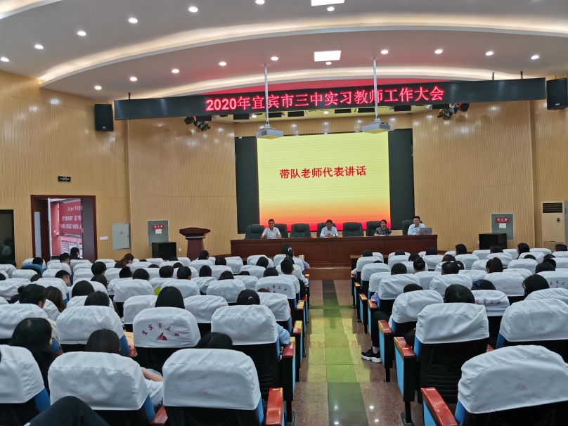 下午四点二十,宜宾市第三中学举行了2020年宜宾市三中教师工作大会,大会中,宜宾三中党委书记何舰老师对我们到校实习表明热烈欢迎,同时对我们的实习工作提出一些建议和意见,比如我们该如何备课,如何讲题等等,并且对我们人身安全予以关心。